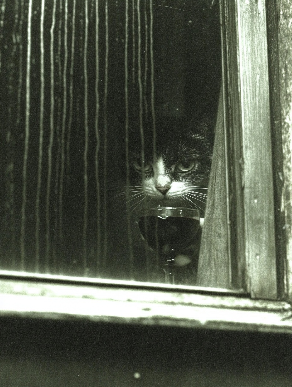 Это хозяин стоял у окна и потягивал, а кот сидел рядом за компанию. Хозяин поставил бокал и на минуту отошёл, а кот продолжает сидеть, по-прежнему индифферентный к бокалу.