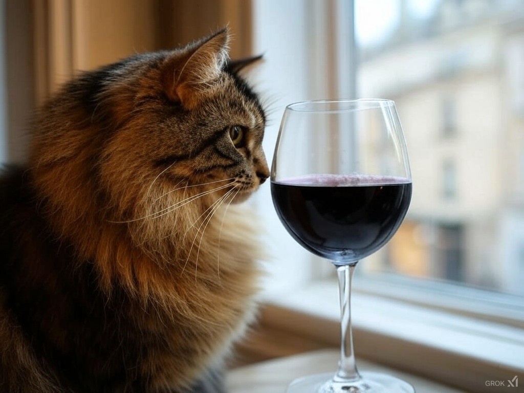 вид у кота поддатый, судя по зрачкам. Интересный нюанс - на всех картинках бокал выглядит таким, как будто из него не пили. Стенки бокала девственно чисты. Вино так себя не ведет )