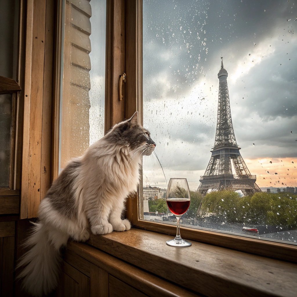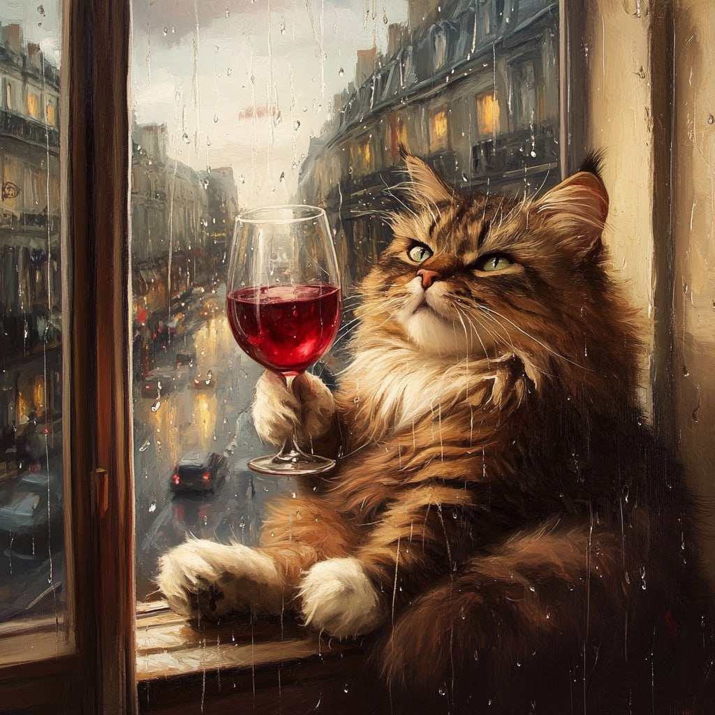 А вот midjourney сделал всё, как сказали. И Париж виден и котик бокал держит.