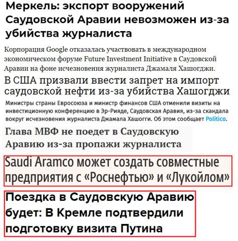 Самое главное - потрясающий бред и ложь о двойных стандартах запада в отношении как всегда несчастной и пинаемой Россиюшки. 20 с лишним лет запад требовал то прекратить геноцид мирного населения в Чечне, то перестать преследовать инакомыслящих, убивать журналистов, отжимать успешные бизнесы и т.д. и т.п. Замечу, без санкций. Даже реакция на убийство Магнитского, по сути, куда более вопиющее, чем выходка саудитов, была, отнюдь, не такой резкой, как сейчас. Некоторые, и я в том числе, наоборот были недовольны пассивными действиями запада, что выглядело двойными стандартами из-за РФ и постоянными преференциями в ее адрес, что бы она не вытворяла. Долго раскачивалась, несколько лет потребовалось, чтобы принять персональные санкции против непосредственных участников истории с воровством НДС и устранением аудитора, вскрывшего и предавшего огласке этот факт. Окончательно приехали, совсем недавно, когда запад понял, что ботоксный диктатор и его система окончательно слетели с катушек. Только тогда реально заработал санкционный механизм, до сих пор набирающий обороты. Так а вы чего хотели? 20 с лишним золотых лет "творю, что хочу" прошли. Ведущие державы подают четкие сигналы о том, что то, что еще совсем недавно сходило с рук, и саудитам тоже, теперь будет чревато бОльшими последствиями.