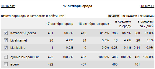 К вопросу о том, почему так "важно" регистрироваться в каталогах, чтобы получать оттуда переходы. Моя статистика за вчера. И заметьте, что я в Яндексе и LiveInternet в своей категории - на первом месте.