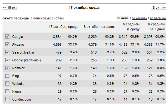 Ну и сравним со статистикой по поисковикам. Кстати, соотношение трафика - также интересно. Оно заметно изменилось за прошедшие пару лет.