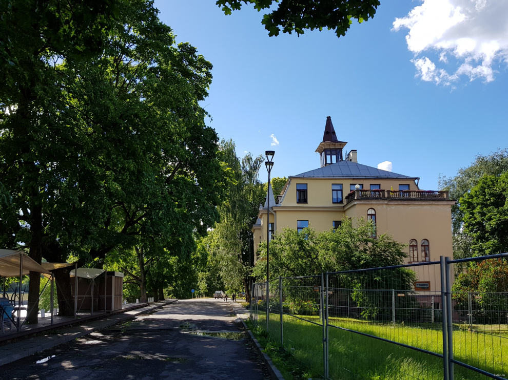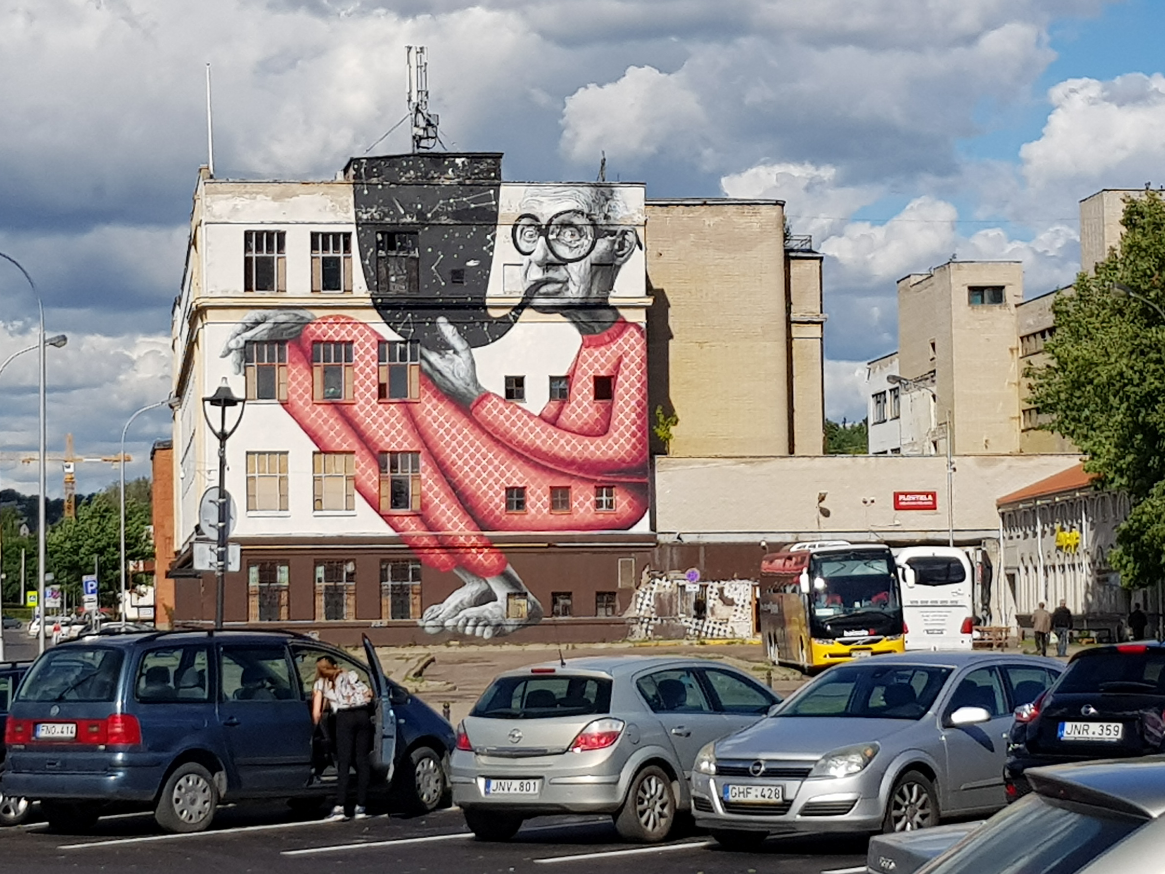 Веселый дядя на стене дома провожает нас с парковки - отправились назад в Вильнюс.