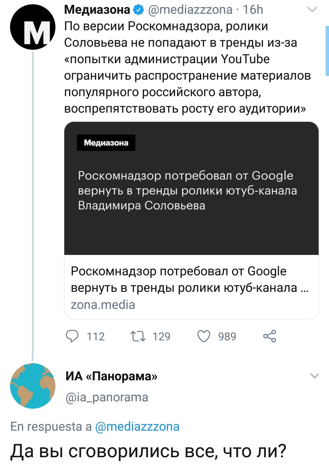 — а не попросил ли Youtube в ответ на неформальные обращения "сверху" написать официальный запрос, потому что у них "так положено" взаимодействовать с регуляторами и госорганами? Если отложить в сторону идиотизм темы, кто-то в РСН мог не понять иронию и действительно написать официальное письмо.