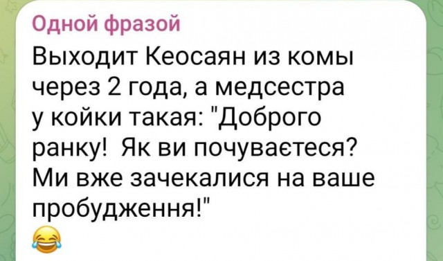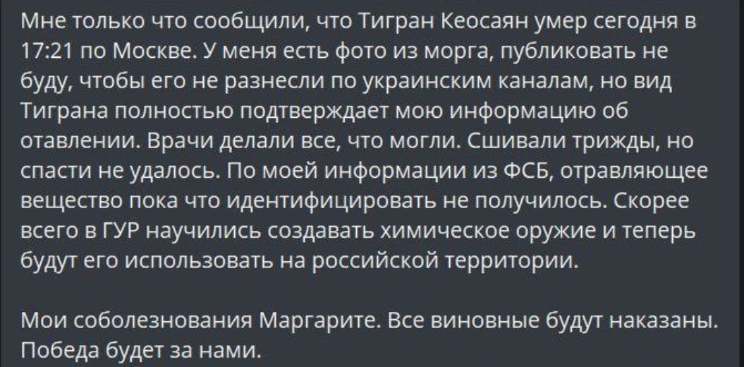 1. Смерть Кеосаяна (пока не случившаяся) не остановит войну, не принесет победы Украине и не деморализует тех, кто ее разрушает и убивает ее народ, и не уменьшит число оболваниваемых ежедневно пропагандой моих сограждан. Печально, но факт.