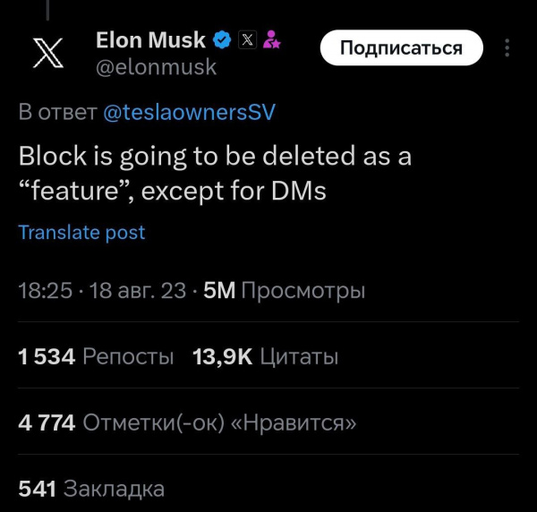 Илон Маск собирается отрубить возможность блокировки пользователей, кроме как в личных сообщениях. Это означает, что вы больше не сможете оградить себя в этой Х-сети ни от одного урода, который гадит у вас в комментах.