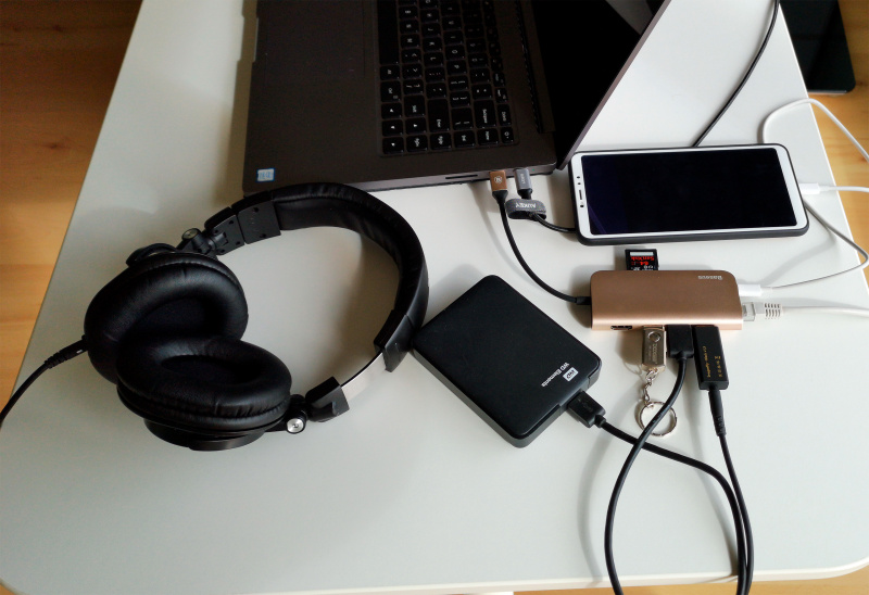 Я только с новым ноутом оценил, насколько классный хаб "Восемь в одном" я в свое время купил. Подключается и к USB, и к Type-C, сам имеет три порта USB 3.0, HDMI 4K, Ethernet RJ45, SD-reader, microSD-reader, Type-C hub OTG. Недешевый, но оно того, на мой взгляд, стоит. (Вот похожий, но сильно дешевле.)