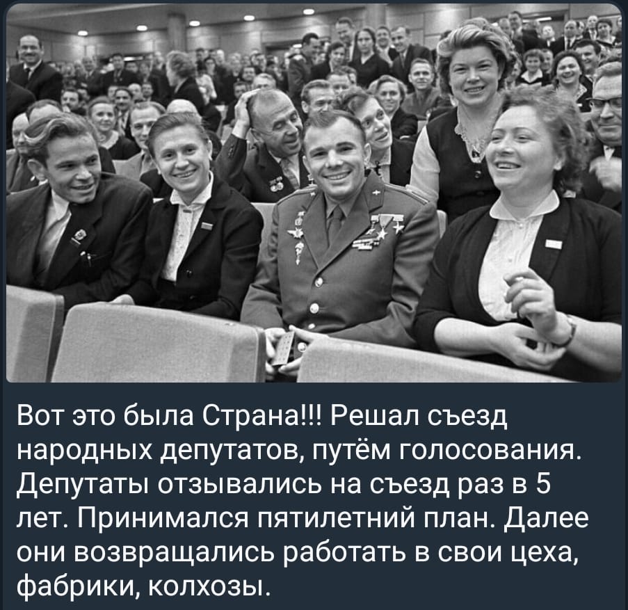 Неграмотная картинка:) Съезд народных депутатов СССР существовал в 1989-1991 годах, так что Гагарин никак не мог быть его депутатом. Был верховный совет, который два раз в год собирался на сессии. Но то, что депутаты возвращалась на работу- правда))