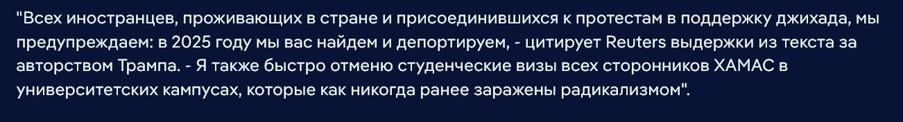 «Всех иностранцев-резидентов, которые присоединились к протестам сторонников джихада, мы ставим в известность: приходите в 2025 году, мы вас найдем и депортируем», - говорится в фактологическом бюллетене Трампа.