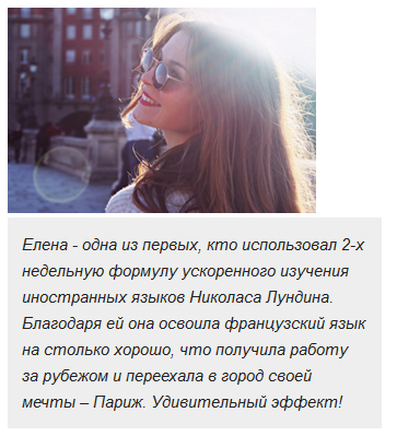 Где уже от какого-нибудь русского имени представляете метод Лендина, рассказываете, что уже двадцать лет руководите лингвистической школой в Москве, которая неоднократно становилась призером главной премии фестиваля в Мончегорске, брякните что-нибудь по поводу "активаторов центров памяти" и "рецепторного запоминания нижневенных хромосом", и не забудьте привести мнение какого-нибудь безусловного авторитета, например (реальная цитата): "Кроме того, что он был исследован командой нейролингвистов, он также был протестирован мною и многими другими людьми, например, Дианой из Нижнего Новгорода".