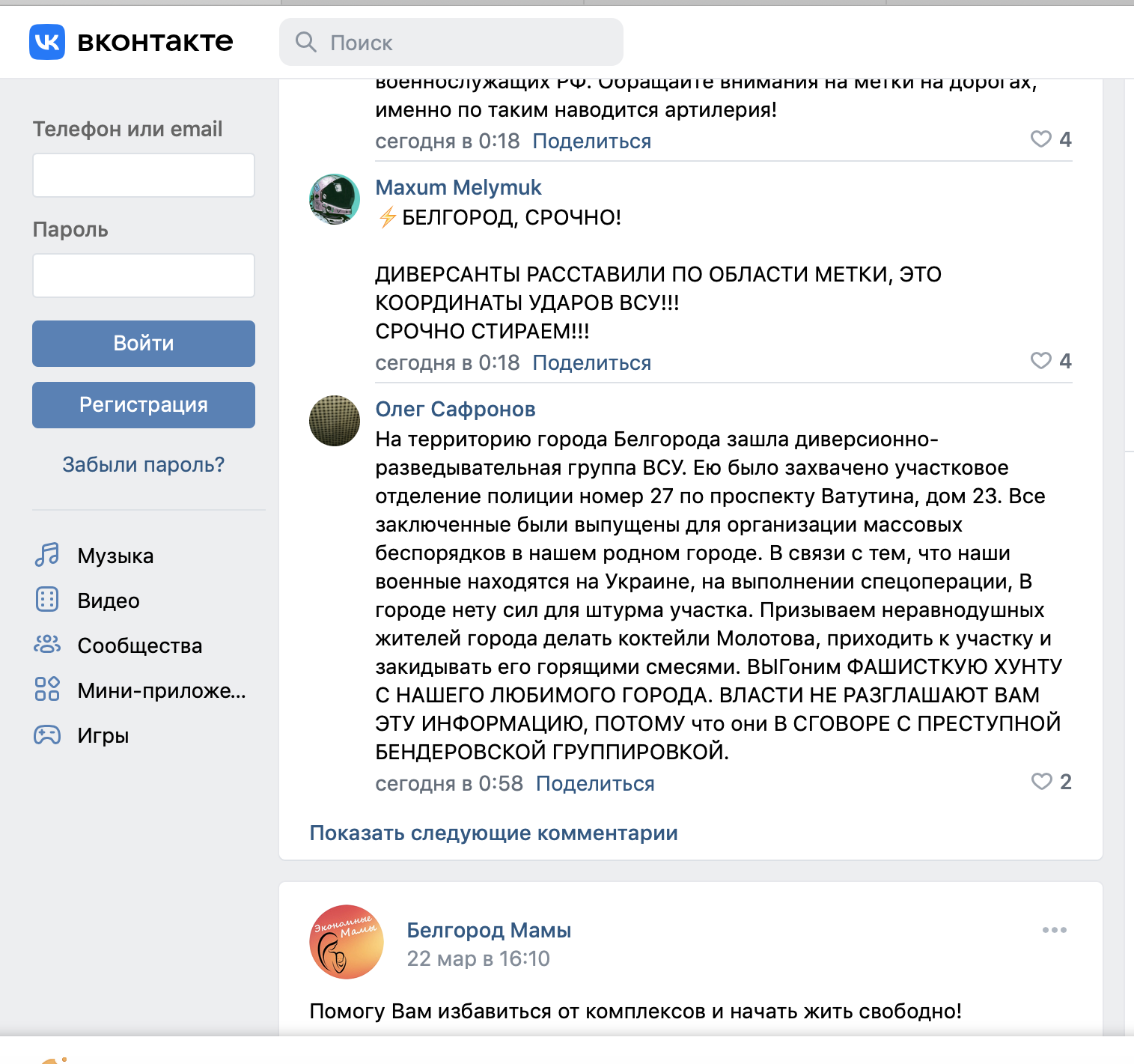 Есть такой сайт - пикабу, на котором идут обсуждения самых разных тем, в т.ч. и ситуации вокруг Украины. И там заметен очень интересный эффект: если у поста есть тег "политика", то в нём плюсуются комментарии с проправительственной точкой зрения, а те немногие, которые выражают противоположную точку зрения, топятся в минусах. При этом провластные комментаторы очень активны, многочисленны и агрессивны, своих оппонентов без ответа не оставляют, но ответы не по существу. Если же у поста этого тега нет, то всё наоборот: проправительственных комментариев мало и они, в основном, в минусах, а комментарии противников "спецоперации" получают плюсы. Существует мнение, что там просто сидит команда провластных ботов, которая мониторит только то, что помечено тегом "политика", а в другие посты не заглядывает.
