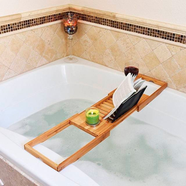 У меня ванна нестандартная, готовую полку не найти. Сделал сам, из реек от старой кровати. Как раз книжка, кружка с чаем, миска с сухофруктами помещается.