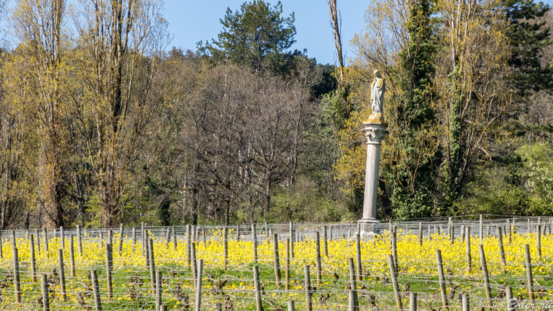 На одном из виноградников установлена вот такая фигура Богоматери: Камий сказала, что фигуру установил ее дед в честь памятного события: в каком-то году в Бургундии были очередные заморозки (такое случается) и много винограда погибло, однако на их виноградниках потери были небольшие, в честь чего он и воздвиг эту статую.