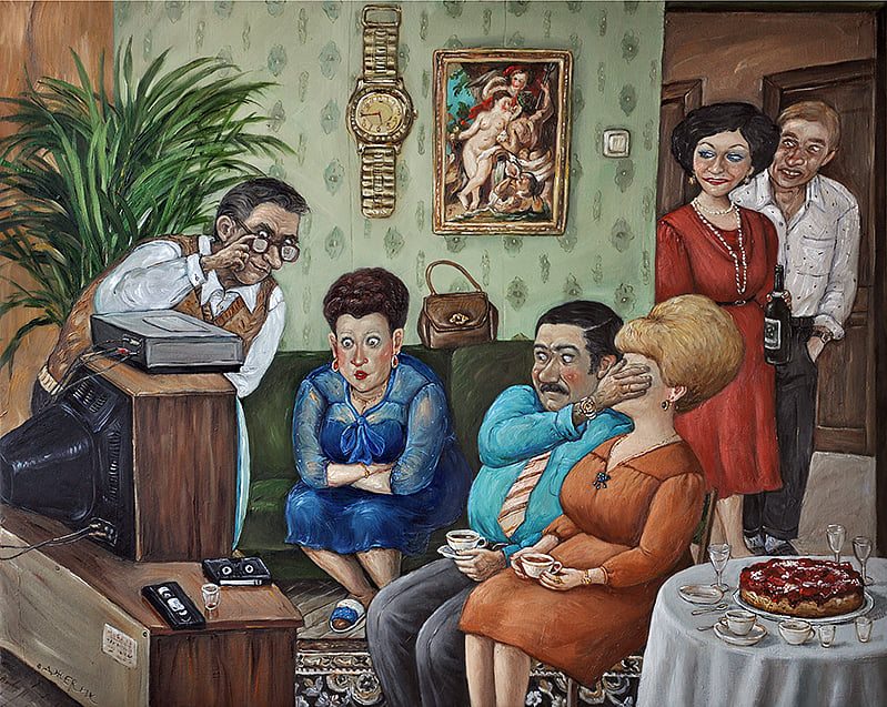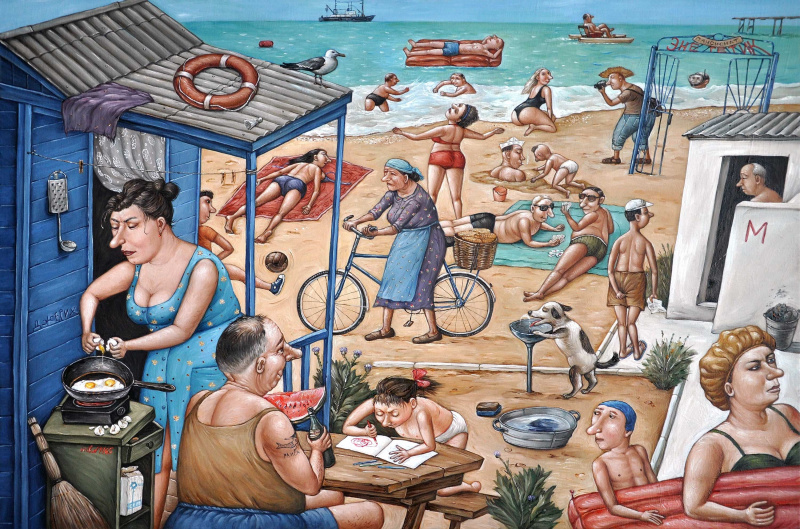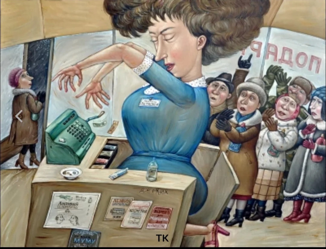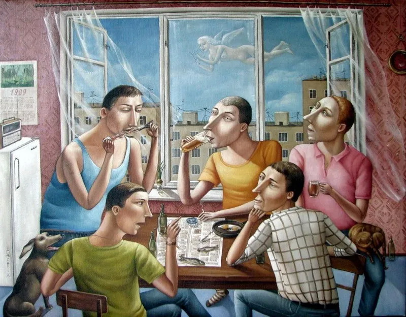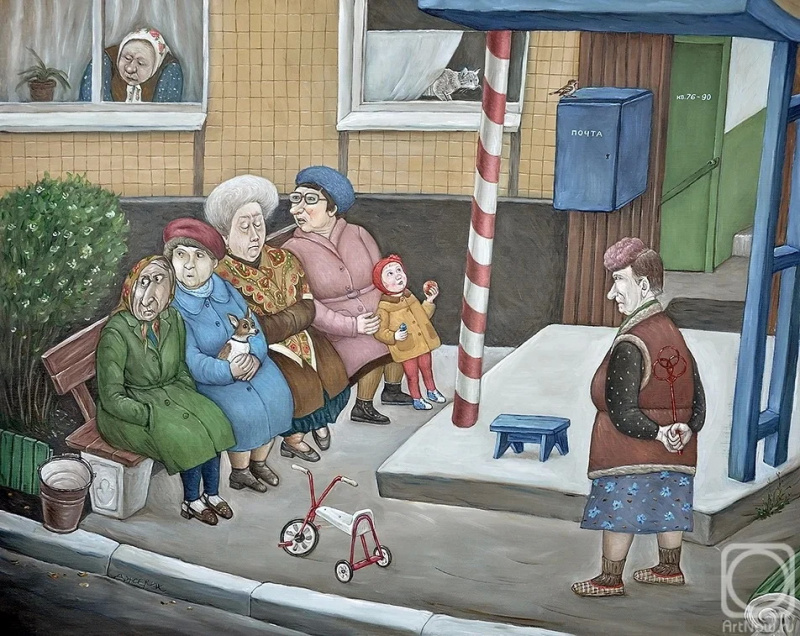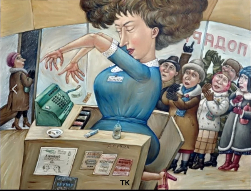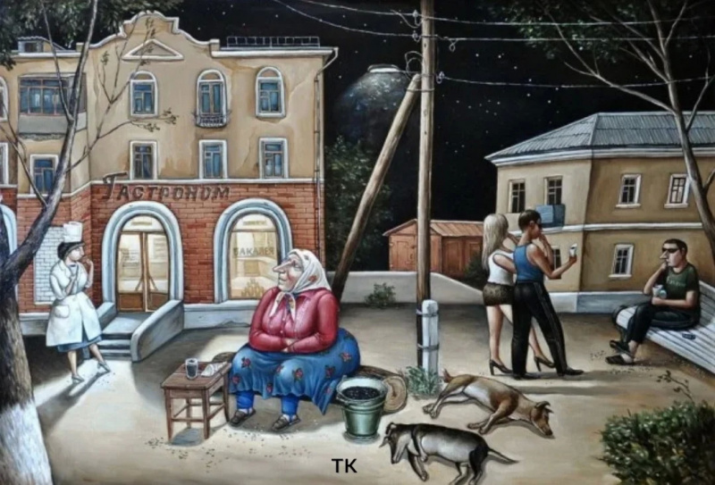 Очень интересная, на мой взгляд, художница Анжела Джерих (она родилась в Донецке, сейчас живет в Крыму) - вот ее Facebook, вот ее Instagram, а вот интервью с ней. Она пишет в различной манере, но самой, как мне показалось, популярной у нее является серия картин "эстетика советских будней". Вот несколько примеров.