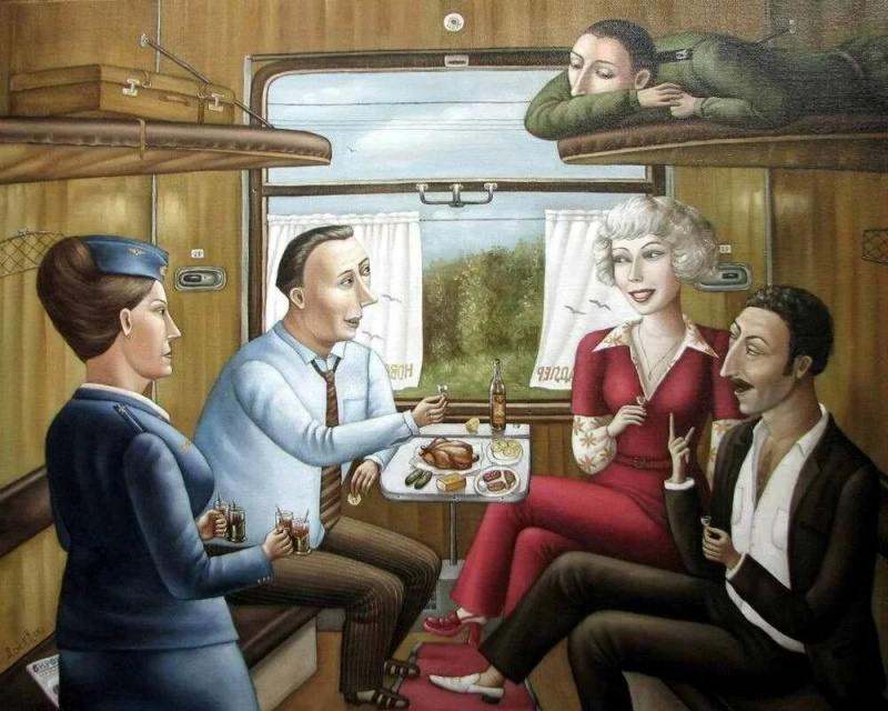 В купе поезда тоже клевая атмосфера. На багажной полке дипломат лежит..