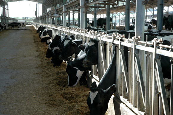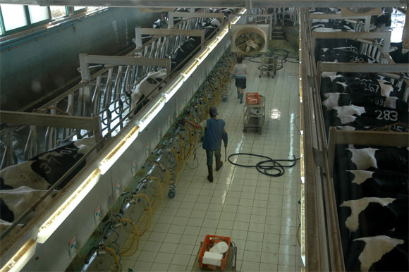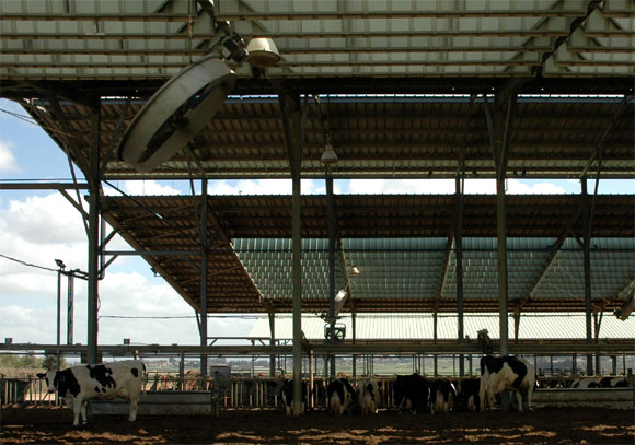 В нем порядка 500 голов. Находятся они все время под специальным навесом, стен там нет. Навес высокотехнологичный - автоматически регулирует солнечный поток в зависимости от температуры, погоды и так далее. Коровы плохо переносят жару, поэтому внутри установлены многочисленные вентиляторы, а вся система спроектирована так, что под навесом температура градусов на пять меньше, чем на улице.