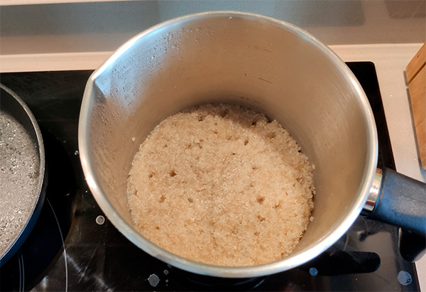 Я взял два стакана воды на стакан киноа, попытался промыть, но у меня не очень получилось, потому что крупинки очень мелкие и сквозь сито проваливались, закинул в кипящую подсоленную воду и варил 10 минут. Без толку, крупинки не увеличились, водой так и покрыты. Еще 15 минут. Уже лучше, но все равно вода осталась. Еще 20 минут. Ура-а-а-а, получилось, вода почти вся ушла.