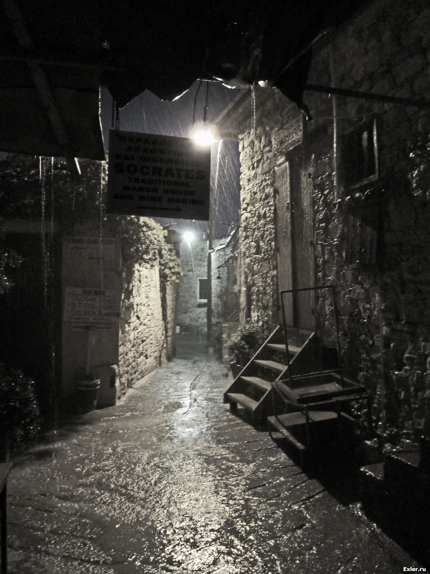 Разгребал старые фотографии с Кипра. Это где-то года полтора назад. Мы тогда заехали в маленький городок в горах. Я был дико голодный и дико злой (я всегда злой, когда голодный), а там еще как следует ливануло. Получилась вот такая фотография.