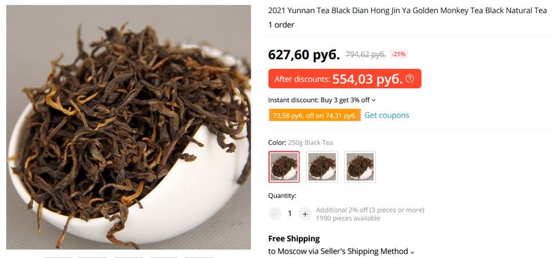 Стал искать на Aliexpress. С названиями там сам черт ногу сломит, поэтому искал по слову Yunnan. Нашел вот такой вариант, заказал чисто на пробу. $9 за 250 граммов - относительно недорого.