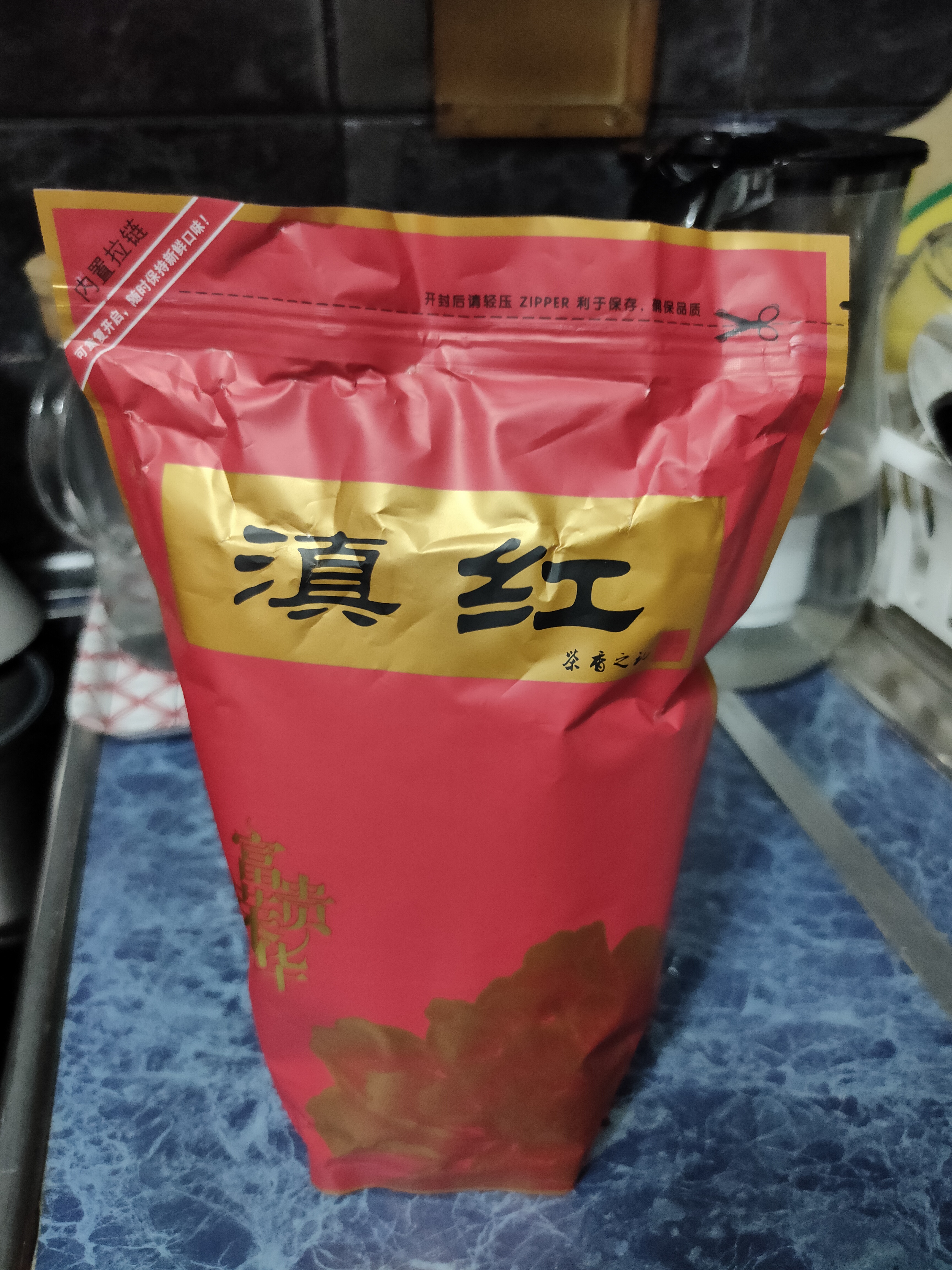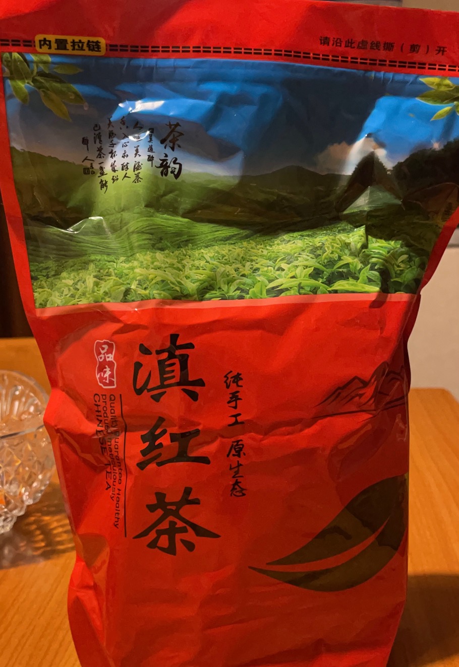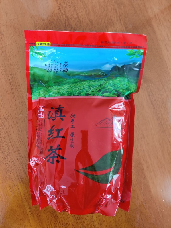 Вот он пришел - открываю посылку - совершенно другой пакет, красный, надписи на нём нейтральные - гугловский фото-переводчик выдал мне что-то типа "Настоящий чёрный чай ручной сборки" - и ряд поэтических цитат поверх пейзажа чайной плантации.