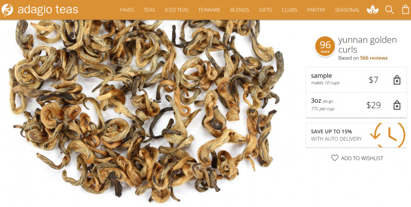 Что-то соскучился я по чаю Yunnan Golden Curls, который изредка покупал на американском сайте Adagio Teas. Я его очень люблю, но он очень дорогой: $29 за 85 граммов (плюс недешевая доставка из Штатов), я столько же плачу за килограмм своего обычного чая Ceylon OP HIGHGROWN, который покупаю на немецком Amazon, причем доставка там бесплатная.