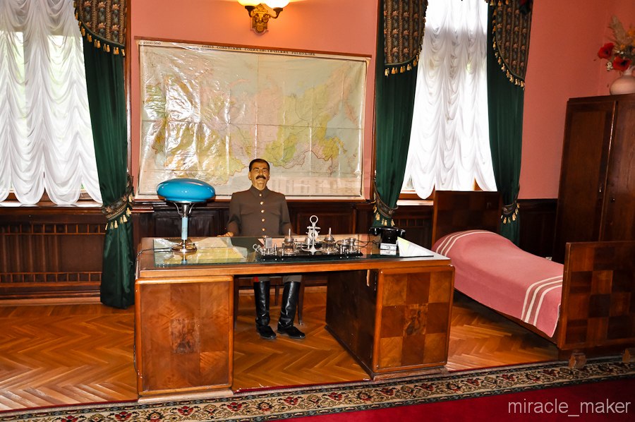 Стол у Сталина как у секретаря райкома. Какие-то подсвечники без свечей, нет телефонов спецсвязи, зато углу граммофон начала века, ковры не по уставу. Абажур на настольной лампе китайский, в райских птичках. Ни одного портрета классиков марксизма-ленинизма.