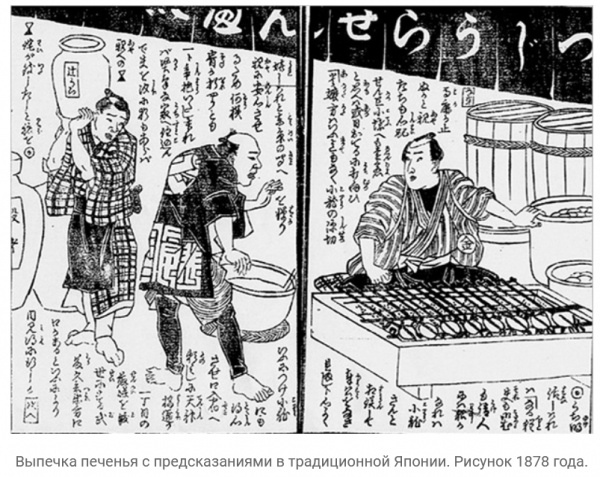 Откуда же тогда пошло это блюдо? Доподлинно известно, что ещё в XIX веке нечто похожее готовилось в Японии, где издавна популярны омикудзи — бумажки с предсказаниями, которые можно было вытянуть в местных храмах. Печенье же, именуемое «цудзиура сэнбэй», отличалось от западных аналогов тем, что было крупнее, темнее, содержало кунжут и пасту мисо вместо ванили и масла. При этом бумажка с предсказанием не пряталась внутрь печеньки, а вкладывалась в неё. Подобное печенье делают в Японии и сегодня.