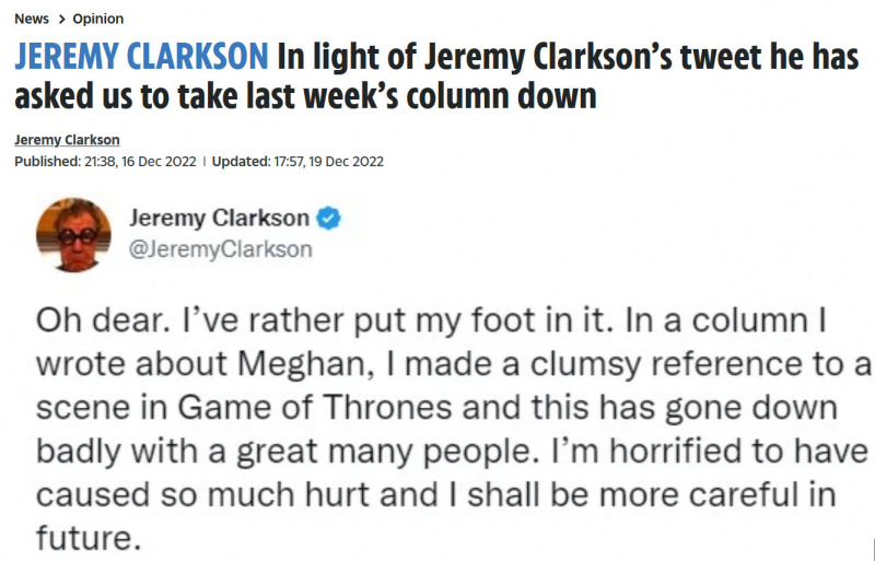 Вчера обсуждали колонку Джереми Кларксона для издания The Sun, посвященную Меган Маркл, и вот сегодня на месте колонки висит вот это. Джереми сам попросил убрать колонку, и он в ужасе от того, сколько боли он принес в этот мир данной статьей. В будущем он должен быть более осторожным. Он будет.
