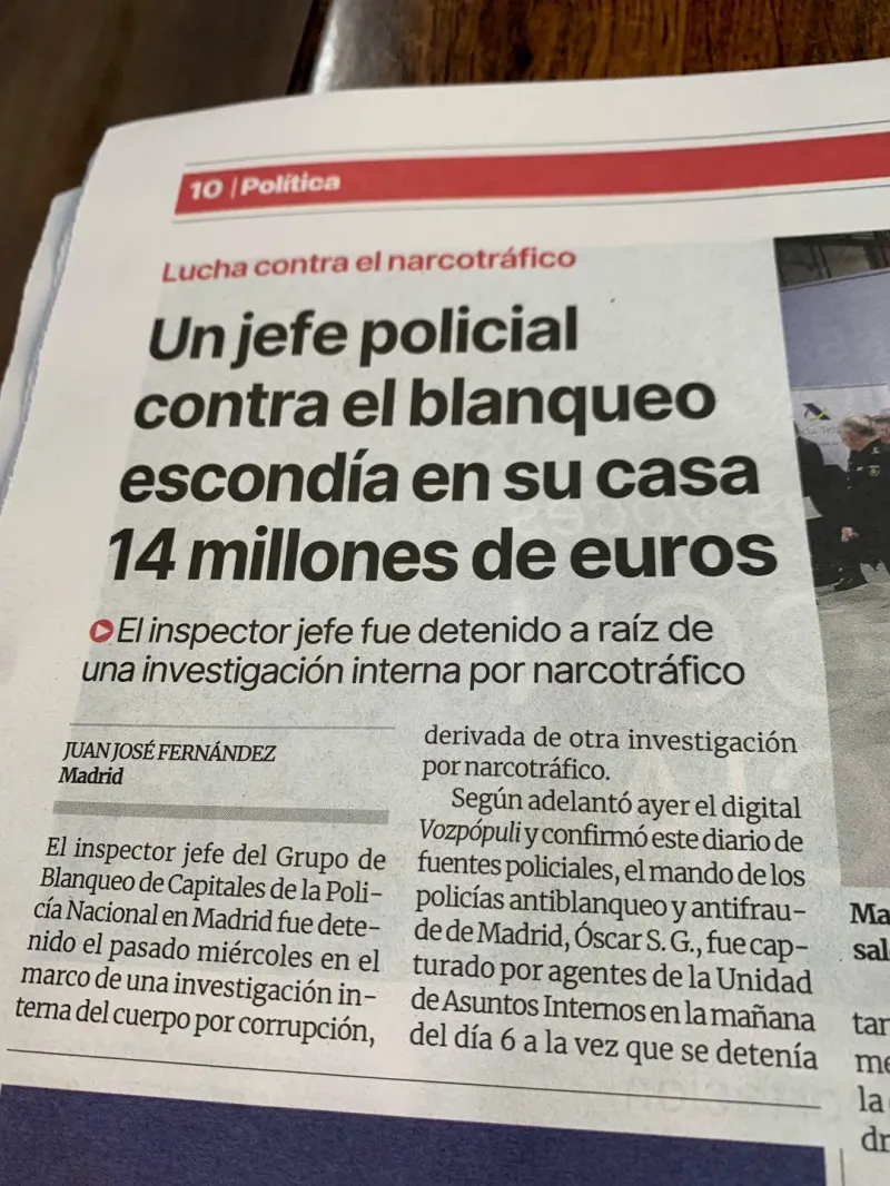 В Мадриде арестовали главу Национальной полиции по борьбе с отмыванием денег. Следили за ним и его напарником давно, целый год, при обыске обнаружили 20 миллионов евро наличкой - видимо, спрятали, чтобы всякие негодяи не отмыли эти деньги.