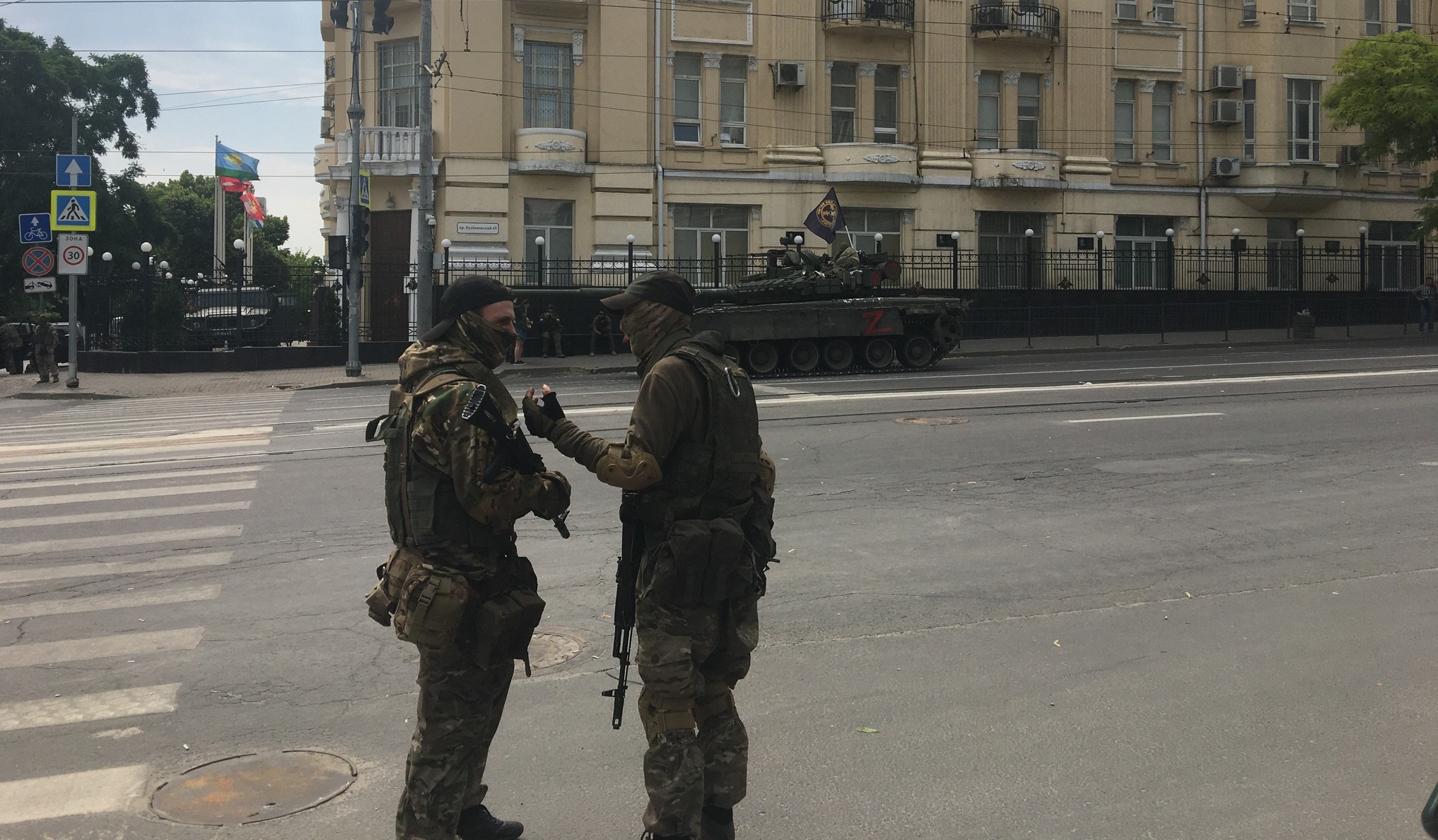 Вагнеровцы с автоматами и белыми повязками на рукавах стояли, ходили вдоль Буденновского проспекта с закрытой проезжей частью; частично патрулировали улицы Пушкинскую, Максима Горького, Большую Садовую. Для пешеходов проходы оставались свободными.