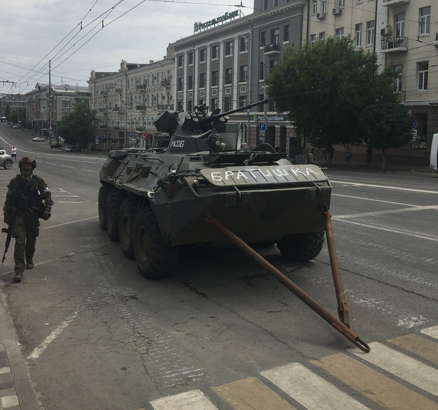 Ни одного полицейского на улицах встречено мной не было. Около Дома Чирикова – старинного здания на Буденновском проспекте, где располагается отделение МВД и Южная таможня, – стояли только пустые служебные автомобили. Позже выяснилось, что ЧВК закрыла в кабинетах сотрудников, прибывших ночью по тревоге, с формулировкой «сидите и работайте». Зато, когда все закончилось, они шумно понеслись по улицам с мигалками.