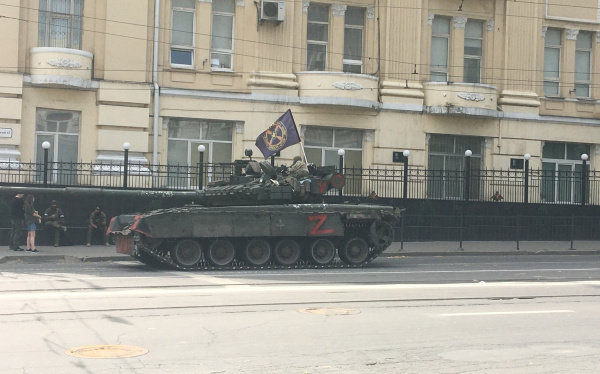 С телефоном я почти сразу напоролась – когда снимала танк, выезжающий из ворот штаба со стороны Пушкинской улицы, вагнеровец, заметив это издалека, начал энергично махать рукой, а потом побежал ко мне. (Утром такого количества зевак еще не было, это позже они привыкли к сотням направленных на них камер.) Ускакала я с небывалой резвостью.