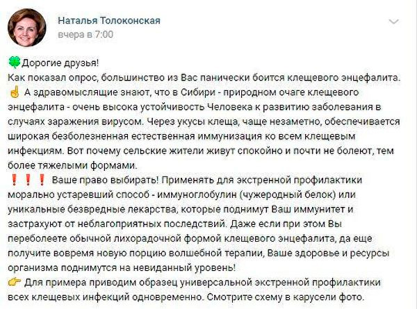 "Как показал опрос, большинство из Вас панически боится клещевого энцефалита. А здравомыслящие знают, что в Сибири - природном очаге клещевого энцефалита - очень высока устойчивость человека к развитию заболевания в случаях заражения вирусом. Через укусы клеща, чаще незаметно, обеспечивается широкая безболезненная естественная иммунизация ко всем клещевым инфекциям", - написала Толоконская во ВКонтакте.