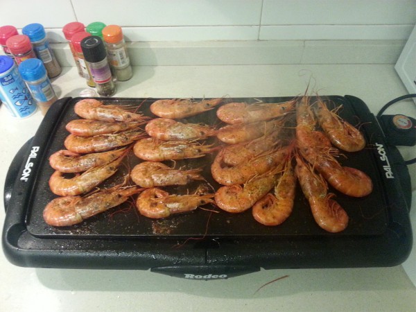 Вчера на ужин попробовали сделать креветок по относительно новой технологии. Взяли аргентинских замороженных - они нужного размера и не вареные. Разморозили за полчаса в холодной воде. Пожарили на планче на 200 градусах по 5 минут на стороне. При этом сбрызнули маслом с чесноком и за пять минут до готовности сбрызнули белым вином и посыпали сухой петрушкой (укроп тут не найти, хотя укроп, конечно, лучше).
