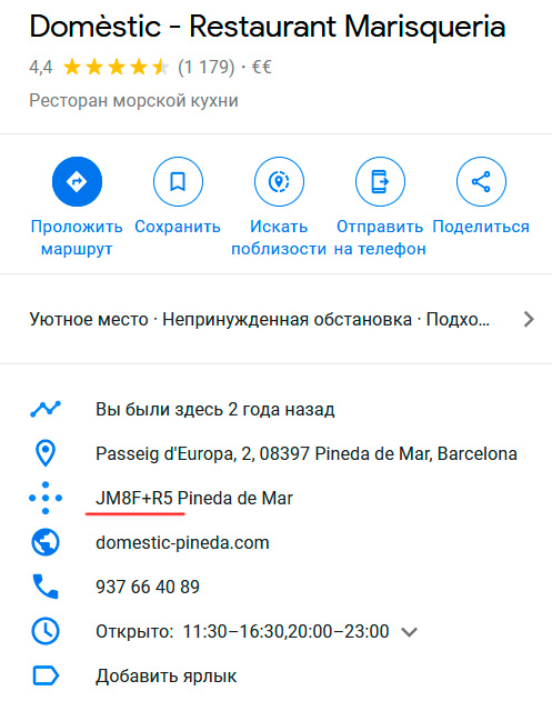 Работает это все очень просто. На сайте сервиса вводите свой адрес или выбираете точку на карте - например, вот этот ресторан. Plus Code выдает ему код JM8F+R5. Вбиваете эти символы в адресной строке карт Гугла - получаете нужный адрес.