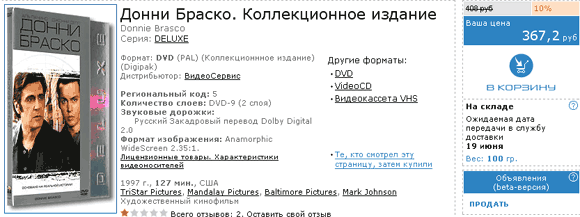 Делюкс, между прочим! Снабженный одной-единственной дорожкой 2.0 с закадровым переводом. Цена одной коробочки - 268 рублей. С фильмом - 367 рублей. По-моему, гениально!