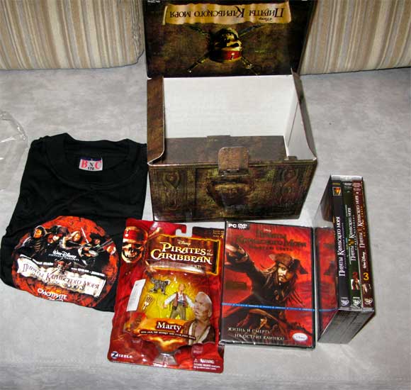 Ну а внутри, разумеется, полный комплект "Пиратов Карибского моря" - аж шесть DVD (сами фильмы и всякие допы). Кроме того, отдельный диск с игрой по "Пиратам...", пластмассовая фигурка какого-то персонажа (я его не признал - какой-то матрос), ну и майка. Круто!