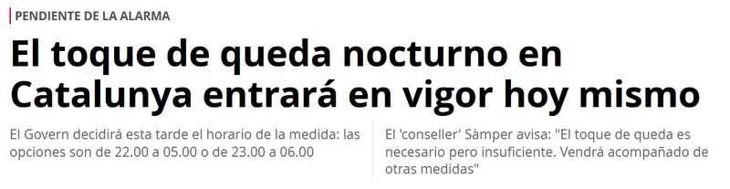 Статья в El Periódico - "El toque de queda nocturno en Catalunya entrará en vigor hoy mismo".