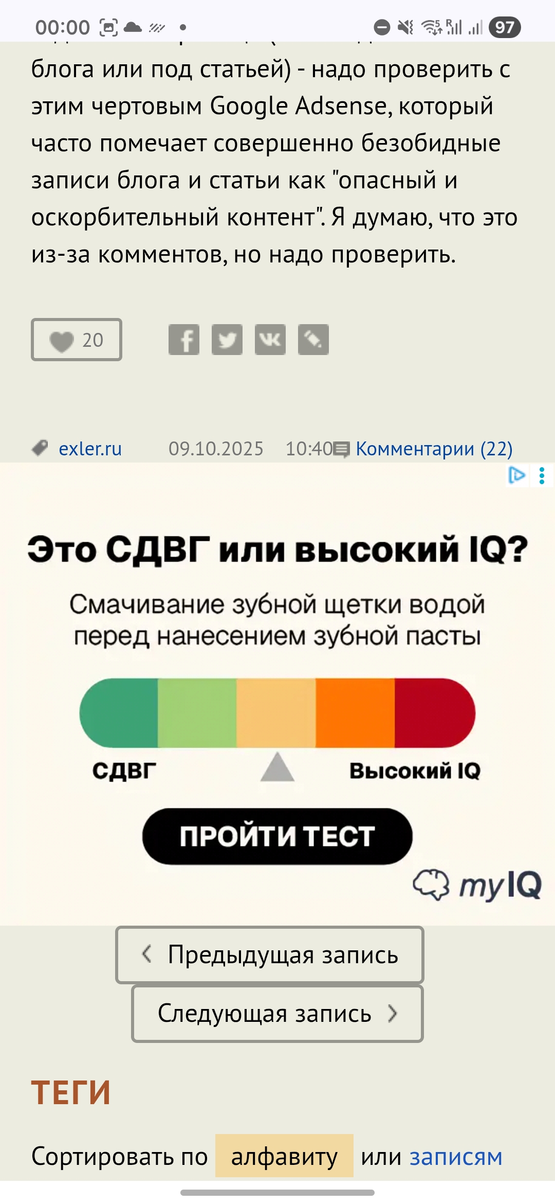 Временно включил комментарии на отдельной странице (а не под записью блога или под статьей) - надо проверить с этим чертовым Google Adsense, который часто помечает совершенно безобидные записи блога и статьи как "опасный и оскорбительный контент". Я думаю, что это из-за комментов, но надо проверить.