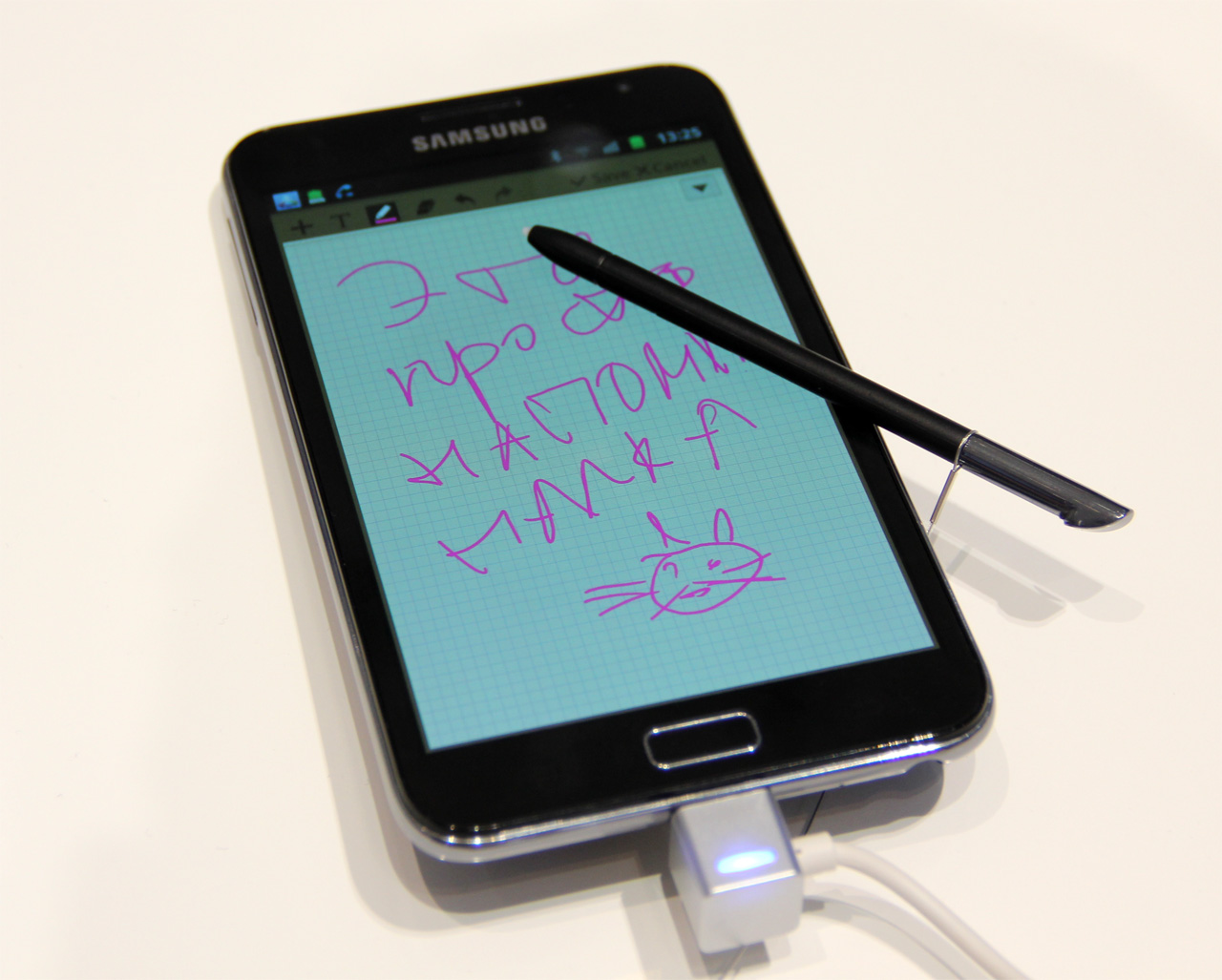 Дисплей, разумеется, емкостной мультитач, но телефон снабжен стилом - специально для рисования и рукописных заметок.