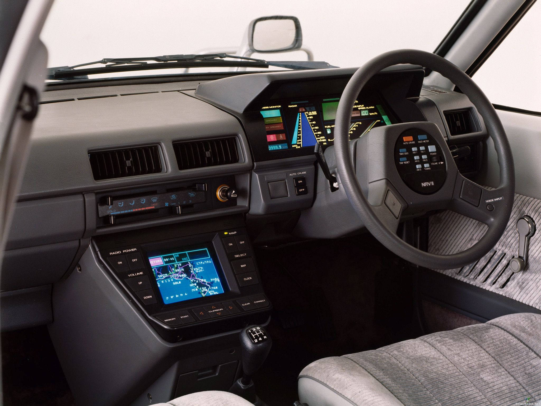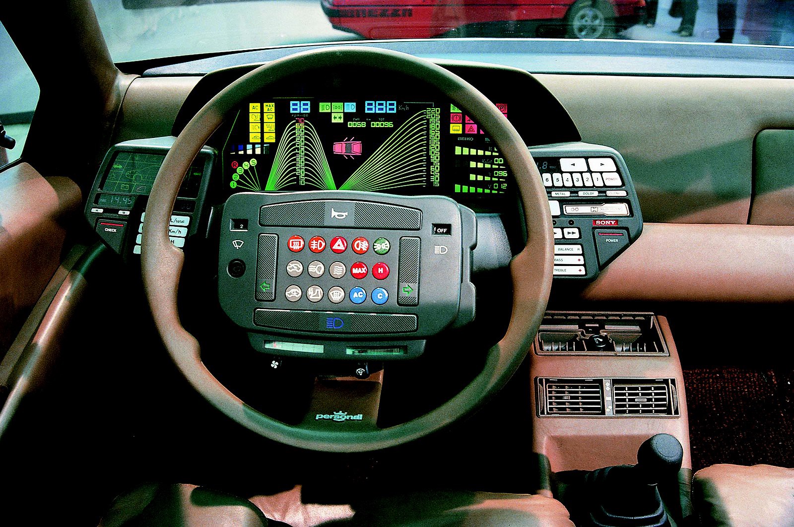 И, кстати, почти во всех концептах тех времён пихали кучу кнопок на руль, но мало кто понимал, что удобнее кнопки ставить на спицах. И, обычно, в концептах делали подушку руля неподвижной, что в итоге неудобно т.к. руль крутится и кнопки каждый раз в разных местах относительно рук (да-да, я знаю про 1 модель Citroen с таким рулём - как раз он и подтверждает это правило)).