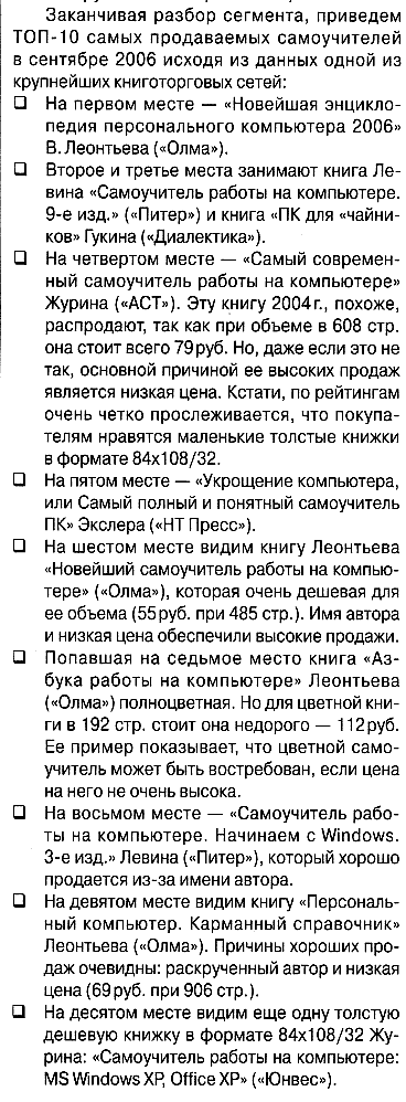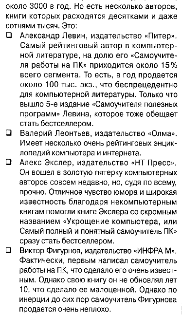 В журнале "Книжный бизнес" опубликовали итоговую статью по состоянию дел в компьютерной литературе. Я там как автор удостоился третьего места после Александра Левина и Виталия Леонтьева, а учебник "Укрощение компьютера" они поставили на пятое место среди первой десятки самых продаваемых компьютерных изданий. Скриншоты и некоторые комментарии - под ссылкой.
