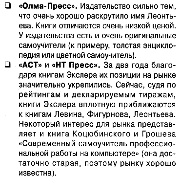 По поводу Олмы - странная фраза: "Издательство сильно тем, что очень хорошо раскрутило имя Леонтьева". Насколько я помню, все было несколько не так. Виталий для них написал "Энциклопедию персонального компьютера", и она долгое время продавалась даже без его имени на обложке. Так что раскручивали они не Леонтьева, а само издание - "Энциклопедию". И раскрутилось оно - потому что учебник отличный, а не потому что "издательство раскручивало имя Леонтьева". Это сейчас имя Леонтьева известно практически всем, что неудивительно.