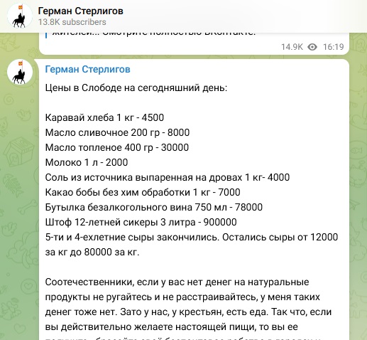 Герман Стерлигов в своем ТГ опубликовал цены на натуральные продукты из его Слободы. Все жутко православное, квасное и патриотичное. Меня особенно порадовала бутылка безалкогольной бурды под названием "вино" за 780 баксов. Но и 300 баксов за 400 гр топленого масла - тоже очень даже душевно, я недавно как раз 500-граммовую банку масла гхи за 5,5 евро купил.
