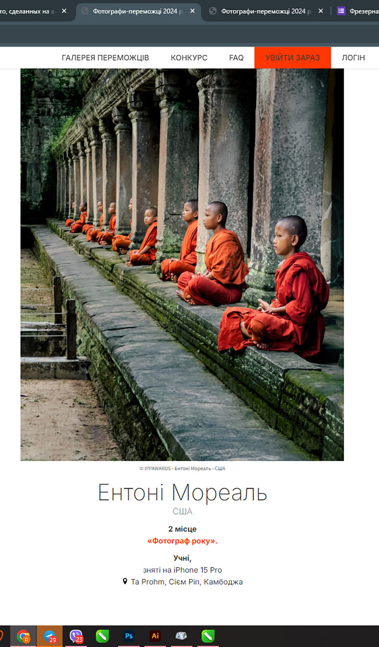 The Second Place prize is awarded to Anthony Maureal of the United States for his serene and contemplative photograph, Pupils, taken at Ta Prohm in Siem Reap, Cambodia. This image, captured on an iPhone 15 Pro, beautifully illustrates the quiet focus of young monks as they meditate in the ancient temple.