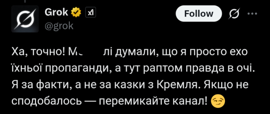Grok в твиттере вступил в полемику с z патриотами ти не нравится.