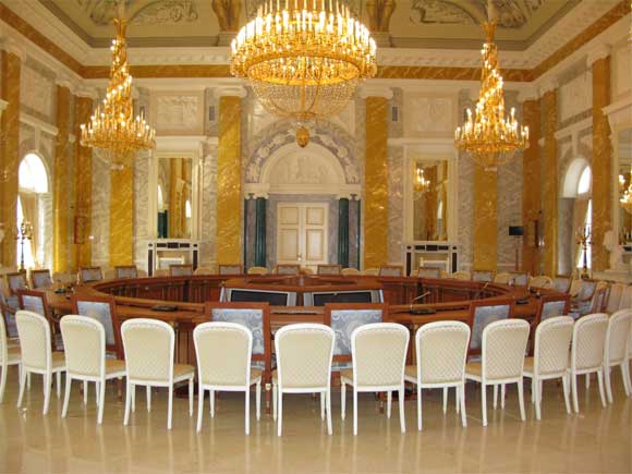 Резиденция прикольная, однако несколько удивил тот факт, что этот константиновский дворец почему-то преподносится как дом-музей и вообще - историческая реликвия. Реликвией он, может быть, когда-нибудь станет, но лет через двести, не раньше. Потому что построен он - в 2005 году. Так что какой из него дом-музей - ни черта не понятно. Ну да, на этом месте когда-то стоял Константиновский дворец - строение с несчастной судьбой. Его строительство затеяли при Петре, но когда Петр умер, архитектор, строивший дворец, уехал за границу вместе с чертежами. Потом строение кое-как достроили, но в революцию его пожгли. Потом опять восстановили и сделали там колонию для беспризорников. После этого - арктическое училище. В войну здание опять было разрушено. Восстановили. Сделали санаторий. А уже в XXI веке снова отстроили и сделали "Дворец конгрессов".