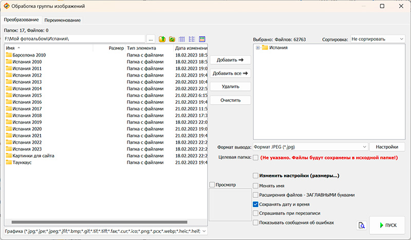 Ну и также я нашел программу "Фотоконвертер" (российская разработка), которая умеет работать со структурой папок, может помещать сконвертированные файлы в исходные папки, она работает достаточно быстро, не сбоит на большом количестве обрабатываемых файлов и папок, и вроде бы она подошла бы для моей задачи лучше всего (хотя и не идеально), но у нее выяснилась одна крайне неприятная особенность: почему-то все портретные снимки при конвертации она поворачивает на 90 градусов. И как это побороть - я так и не нашел. А выяснил я это только тогда, когда программу уже купил (она в демоверсии мало того что лепит свой здоровенный штамп, так еще и позволяет обрабатывать только 5 файлов, на чем я и налетел).