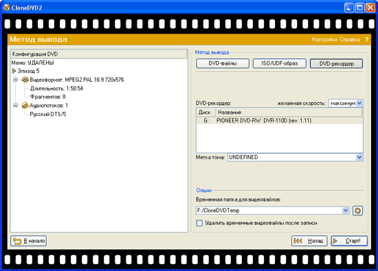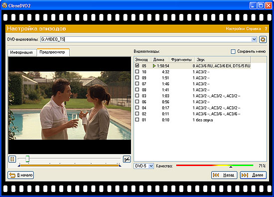 К сожалению, 1Click Copy DVD Pro, о которой я здесь писал, не оправдала возложенных на нее высоких надежд. Делается-то там все удобно, интерфейс вполне наглядный, а вот результат - слабенький. От вырезанного меню остаются какие-то пустые ошметки, от убранных звуковых треков - ссылки на уже несуществующие дорожки. В общем, не CopyDVD Pro, а Copy DVD Lame. За такие деньги - это просто издевательство. Попробовал по совету другую программку - CloneDVD2 (это разработка фирмы Elby.ch, но продается она сейчас под эгидой SlySoft, которая продает также весьма популярную программу AnyDVD). CloneDVD2 понравилась значительно больше 1Click Copy DVD - и с точки зрения наглядности, и с точки зрения результата. Вот как это все выглядит.