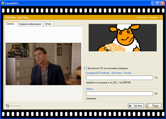 Что интересно, на весь диск уходит минут двадцать, учитывая сжатие. (1Click Pro со сжатием обрабатывал тот же диск заметно дольше.) Полный диск со всеми допами также обрабатывает и пережимает минут за двадцать. Процесс обработки, если вдруг срочно понадобились ресурсы компьютера, можно приостановить. (У ClickPro можно было только отменить.) Ресурсов, правда, кушает немало - процентов 40, но чисто субъективно параллельной работе на компьютере практически не мешает.